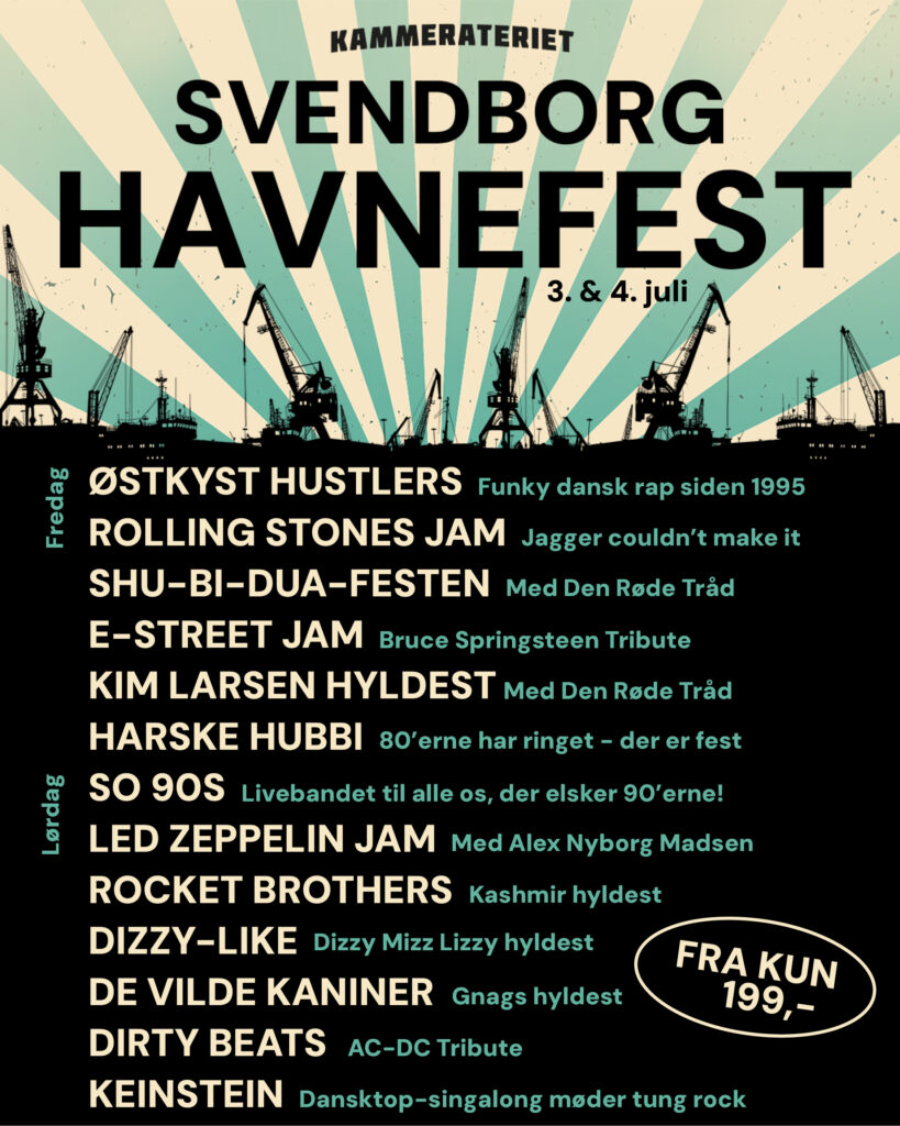 På havnen – bag ved de gamle værftshaller – samler vi en stribe hyldestbands og originalorkestre og lægger i ovnen til et brag af en fest fuld af fællessang, højt humør og skummende fadøl – præcis som en havnefest skal være.